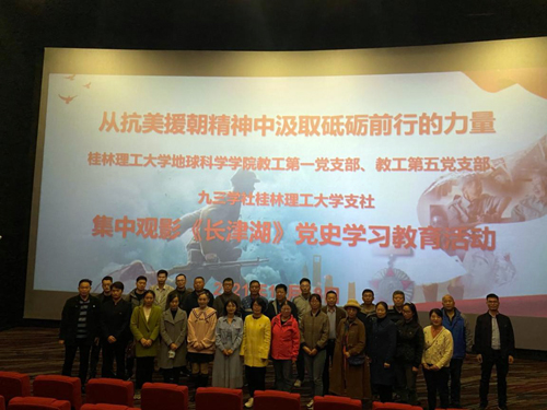 为深入开展党史学习教育,进一步激发党员爱国热情,10月18日下午,我院组织教工第一党支部、教工第五党支部及结对共建的九三学社桂林理工大学支社30余名党员(社员)前往东西巷影城观看党史学习教育片《长津湖》,从抗美援朝精神中汲取砥砺前行的力量。