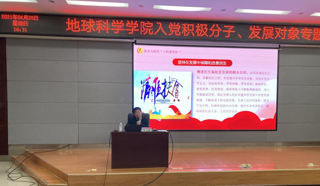 本次党课培训,曹文献书记从习近平新时代中国特色社会主义思想的提出、习近平对习近平新时代中国特色社会主义思想和基本方略的阐述、构成新时代坚持和发展中国特色社会主义的基本方略的“十四个坚持”以及学习习近平新时代中国特色社会主义思想的重大意义四个方面进行详细讲述。最后,曹书记指出,中国共产党历经百年风雨路,艰辛探索救国路,地学院全体学子应当积极向党组织靠拢,做到守初心、担使命,为实现中华民族伟大复兴的中国梦不懈奋斗。