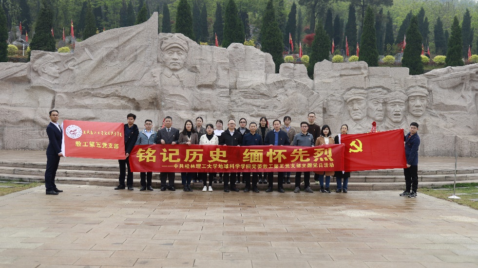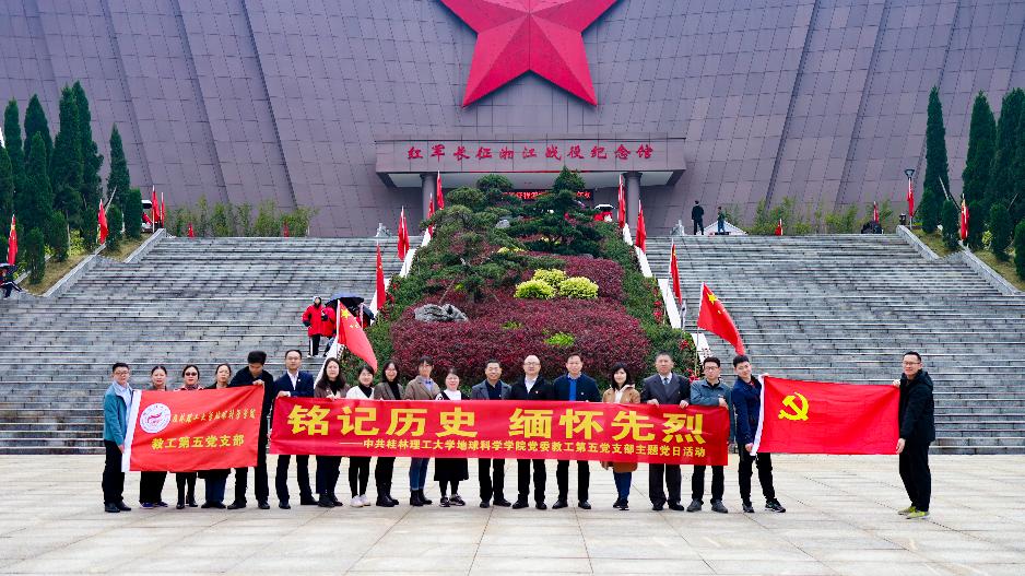 2021年是中国共产党成立100周年,在党的百年寿诞之际,正值清明,为缅怀革命先烈,进一步提高政治站位,扎实开展党史学习教育,引导支部党员学党史、悟思想、办实事、开新局。3月26日,教工第五党支部跟随学院党委在全州红军长征湘江战役纪念园开展“铭记历史、缅怀先烈”主题党日活动,支部全体党员参加了本次活动。