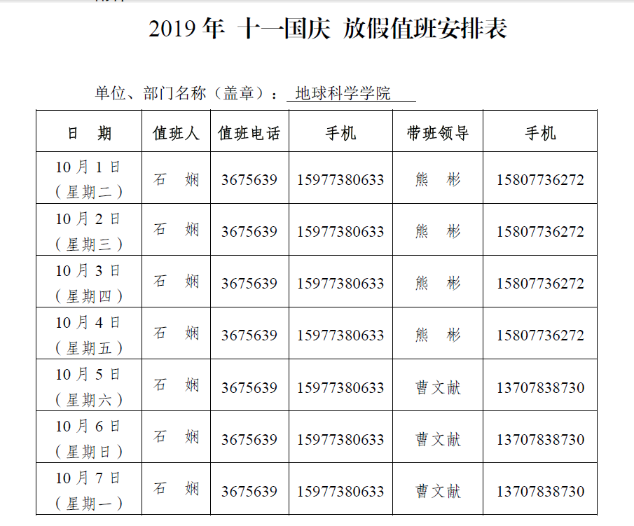 beat365手机版官网入口2019年“十一国庆”放假值班安排表
