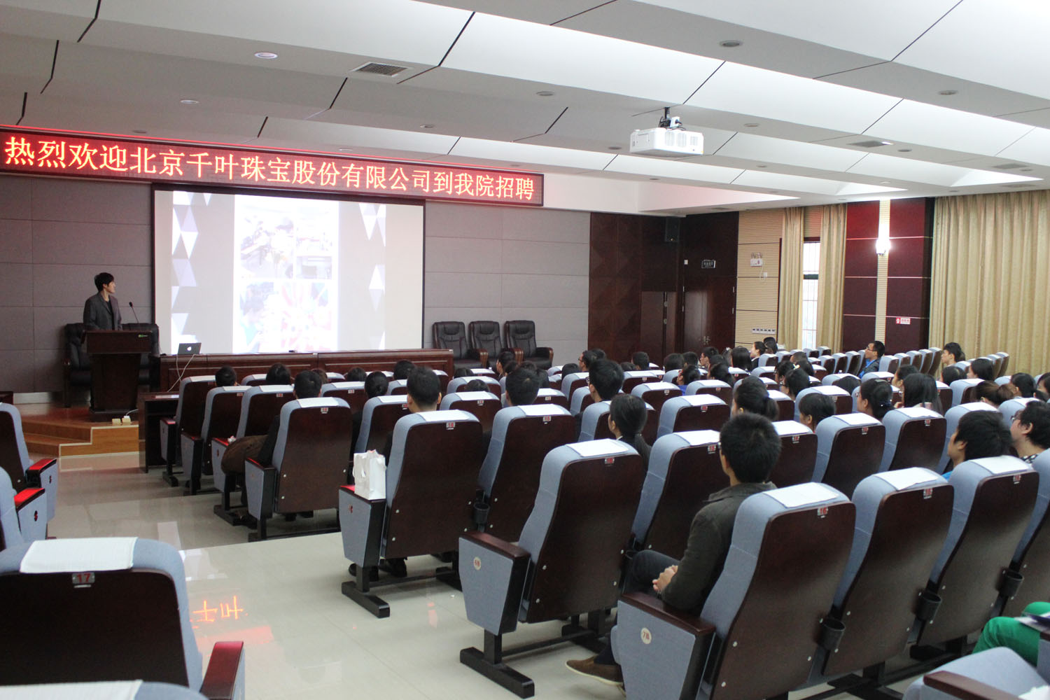 2015年7月4日,北京市千叶珠宝股份有限公司人力资源中心总监邱尔芃一行7人到我院招聘宣讲会,学院党委副书记耿俊茂老师、宝石教研室主任雷威老师,2012级辅导员谷正杰老师以及2012级、2013级宝石专业学生120余人参加了宣讲会。
