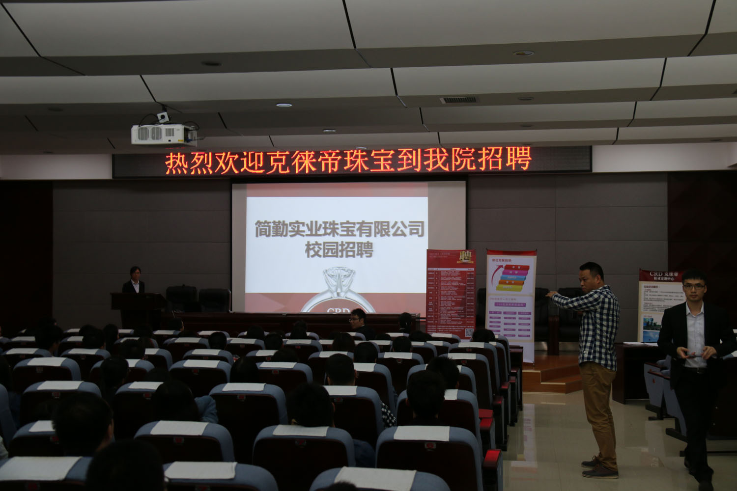 2015年11月6日,克徕帝珠宝有限公司一行8人,在董事贺博的带领下到院招聘毕业生, 2012级辅导员谷正杰老师以及2012级、2013级宝石专业学生110余人参加了宣讲会。