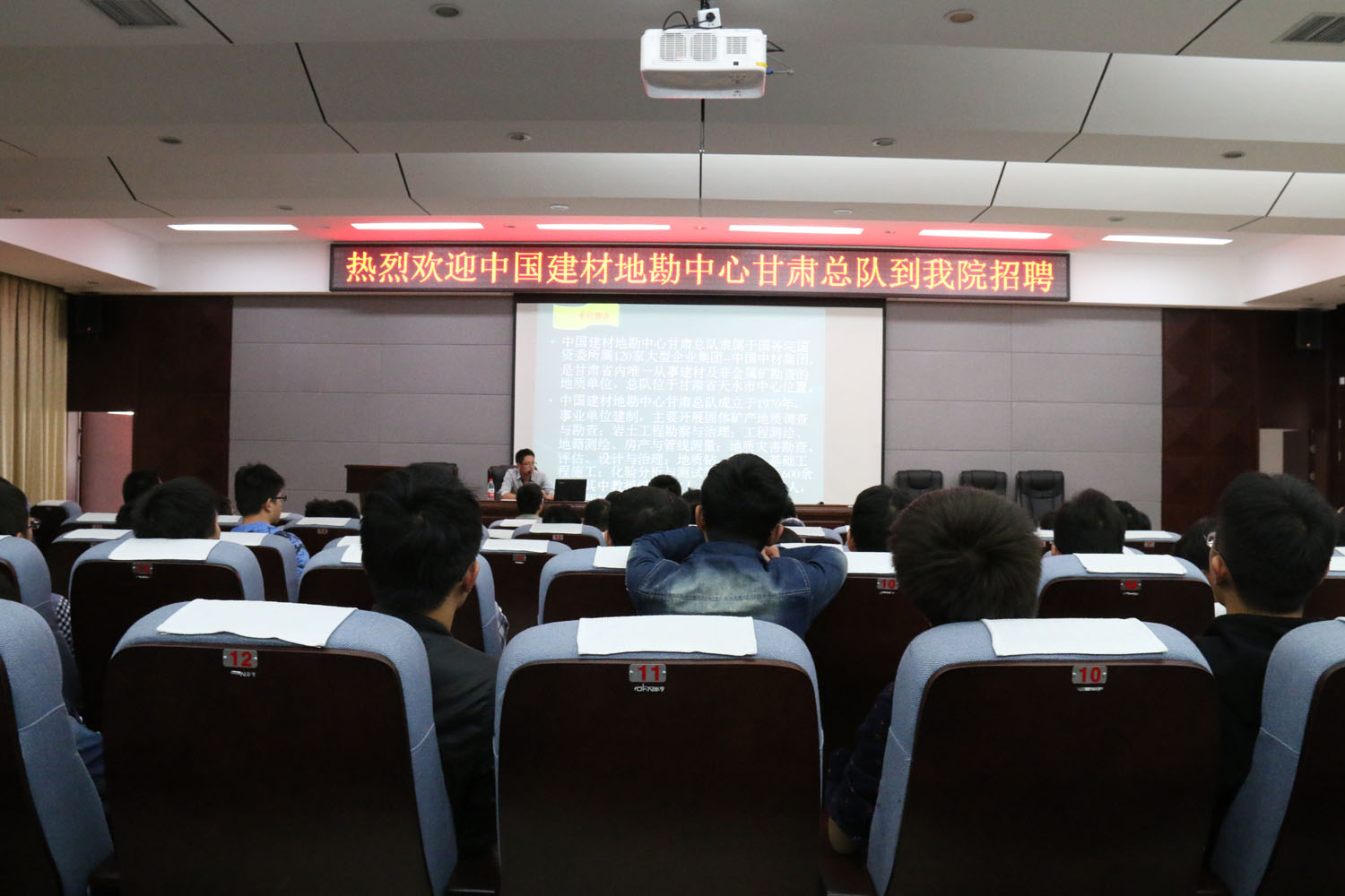 2015年10月28日下午三点,中国建材地勘中心甘肃总队一行2人到我院招聘,12级辅导员谷正杰,资源勘查工程、地质学、地质工程专业的本科生、研究生79余人参与了此次招聘。
