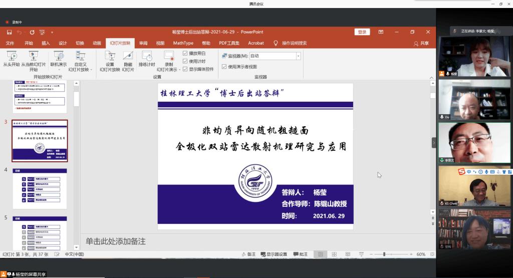 2021年6月29日下午,地质资源与地质工程博士后流动站杨莹博士出站答辩会在线上开展。答辩专家组成员包括:吴立新教授(中南大学),杜阳教授(浙江大学),王玫教授(桂林理工大学)、李景文教授(桂林理工大学)、任超教授(桂林理工大学)。吴立新教授担任答辩专家组主任。此外,智能电磁感知与信号处理实验室老师和研究生参加了此次答辩会。