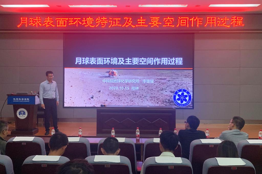 10月15日下午,我院客座教授、中国科学院地球化学研究所研究员、月球与行星科学研究中心主任李雄耀在雁山校区逸夫楼01501报告厅,作题为“月球表面环境特征及主要空间作用过程”的精彩学术报告。报告会由学院院长许成教授主持。
