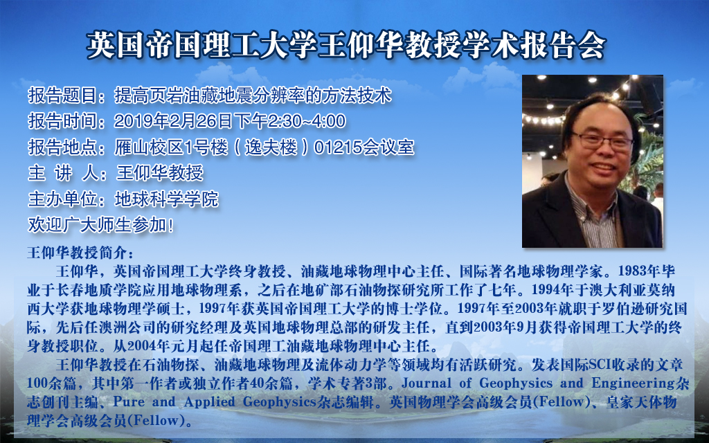 王仰华教授在石油物探、油藏地球物理及流体动力学等领域均有活跃研究。发表国际SCI收录的文章100余篇,其中第一作者或独立作者40余篇,学术专著3部。Journal of Geophysics and Engineering杂志创刊主编、Pure and Applied Geophysics杂志编辑。英国物理学会高级会员(Fellow)、皇家天体物理学会高级会员(Fellow)。