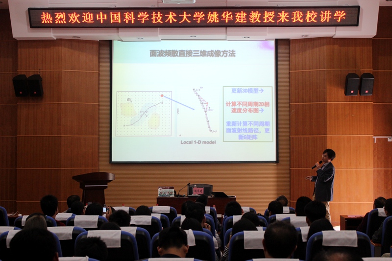 刘代志教授在报告中首先论述了军事地球物理学的缘起、国内外发展现状及今后的展望,结合现代战争中俄美军事武器中的地球物理方法的应用,说明了军事地球物理学的重要性,并且结合自己的科研经历,列举了军事地球物理在实际应用中的实例,论述了地球物理环境对火箭军的影响。姚华健教授在报告中指出,地球深部结构的研究对认识地球动力学问题、地震发震机理及预防、矿产资源开发等问题具有重要理论指导意义。姚华健教授从地震波成像的基本原理及当前地震学方法的研究现状出发,对地震学反演理论及技术进行了一系列重大改进,运用背景噪声、地震面波和接收函数方法等联合成像方法,并介绍了青藏高原东南缘、川西、合肥地区的地震台阵及其深部结构和动力学过程的最新研究成果。最后,在互动环节中,两位教授还以丰富的专业知识为老师和同学们答疑解惑。