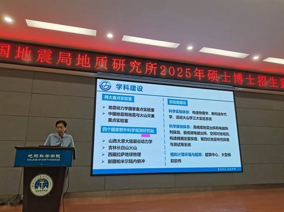 为加强学院对外学术交流与合作,拓展广大师生的科研视野,提高我院学生对中国地震局地质研究所学术平台和博士-硕士研究生招生政策的认识,增强学生报考高水平科研院所的信心,2024年11月12日,我院邀请中国地震局地质研究所袁仁茂研究员、詹艳研究员、教育中心副主任吴妍萍来雁山校区01501报告厅作学术报告并进行研究生招生宣讲。会议由学院副院长庞崇进教授主持,学院相关专业教师、研究生和本科生参加了本次会议并认真听取了报告。