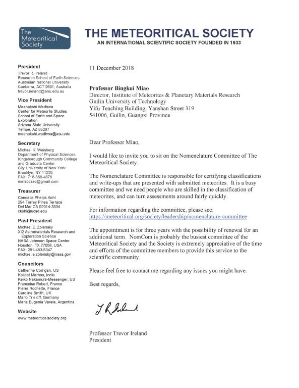 缪秉魁教授担任该国际陨石分类委员职务,不但有利于促进我国陨石学与行星科学研究的发展,而且对我校发展新的学科增长点和一流学科建设具有重要意义。在此,热烈祝贺缪秉魁教授成为国际陨石专家,也期望在他引领下我校陨石学和行星科学研究发展取得更大成绩。