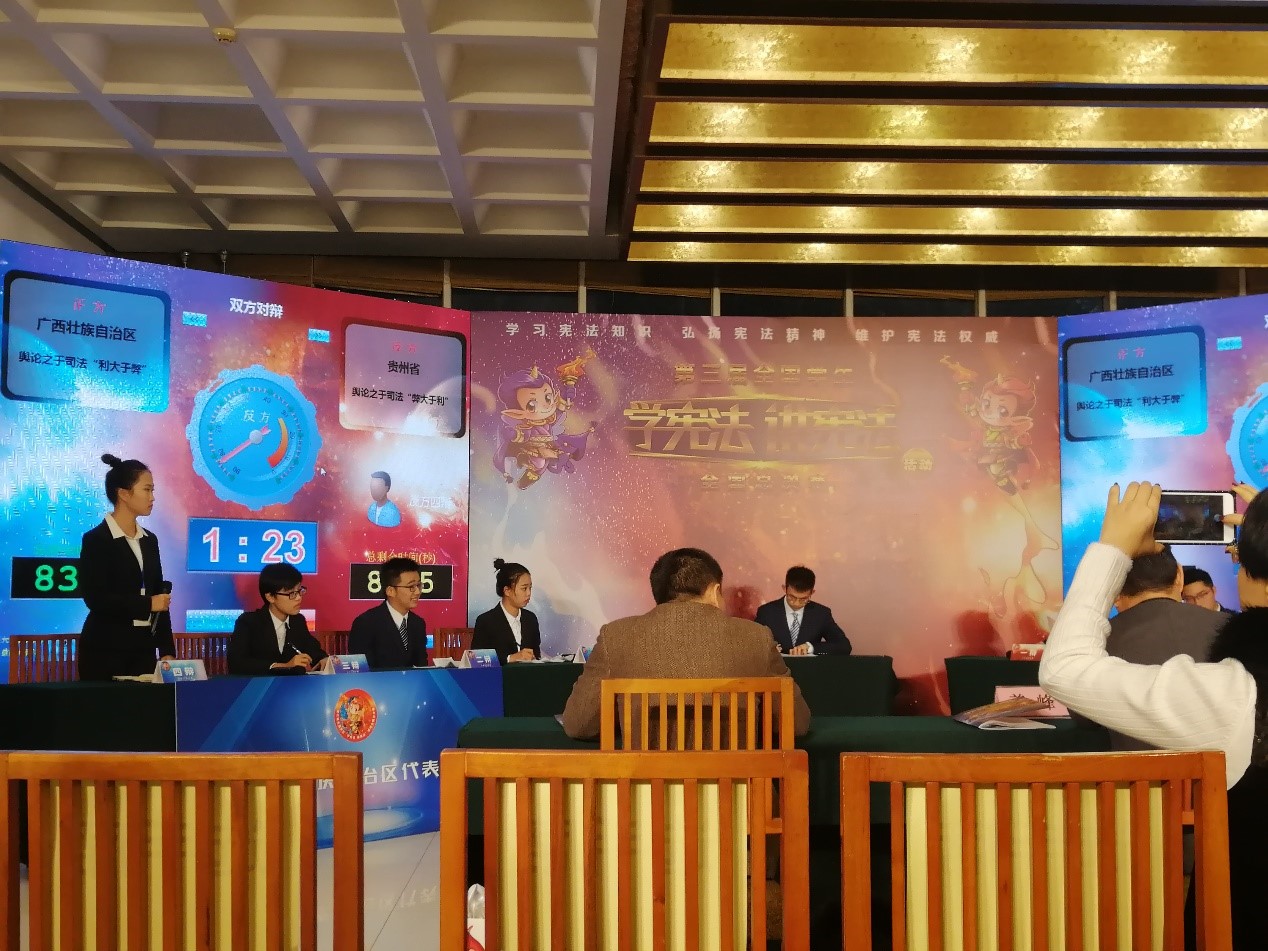 为深入贯彻党的十九大和十九届二、三中全会精神,贯彻习近平新时代中国特色社会主义思想,认真落实深入学习宣传和贯彻实施宪法的有关精神,按照中宣部、中组部、全国人大常委会办公厅、教育部、司法部《关于组织开展宪法学习宣传教育活动的通知》要求,经过选拔,我院资勘17实验班芦思洁,代表我校参加广西区比赛,取得总成绩第二的优异成绩。11月26日在南宁接受赛事集训后,加入广西代表队参加第三届全国“学宪法 讲宪法”活动全国总决赛,与全国其他省市学子共同切磋学习。广西代表队在庆祝广西壮族自治区成立60周年之际,参赛选手展现自我,一争高下,在总决赛中取得三等奖的好成绩。