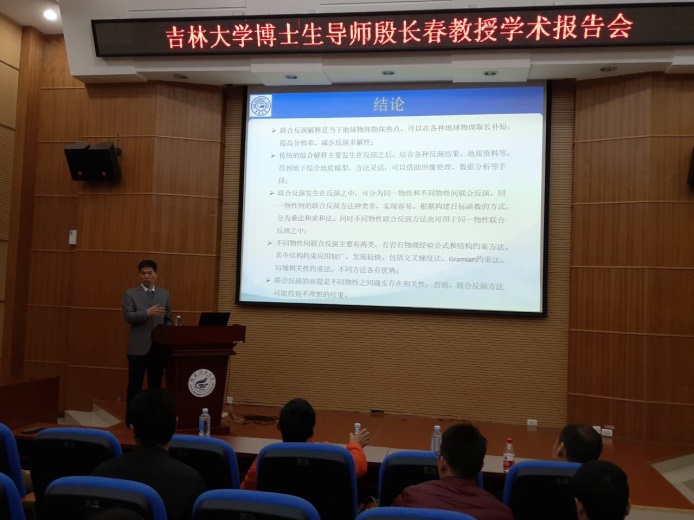 19日的报告会上,殷长春教授从重磁电震数据联合反演的必要性和优势出发,深入讲述了地球物理联合反演的发展历史和反演方法,接着以大地电磁法、可控源大地电磁法和反射地震勘探的联合反演为例,介绍了联合反演的最新成果。21日的报告会上,殷长春教授深入阐述了地球物理电磁三维正反演理论,并介绍了航空电磁三维正反演的最新研究成果及其应用实例。报告会后,殷长春教授与在场师生就地震法与电磁法的联合反演、电磁三维反演的应用、噪声压制等热点和前缘问题进行了深入交流和讨论。