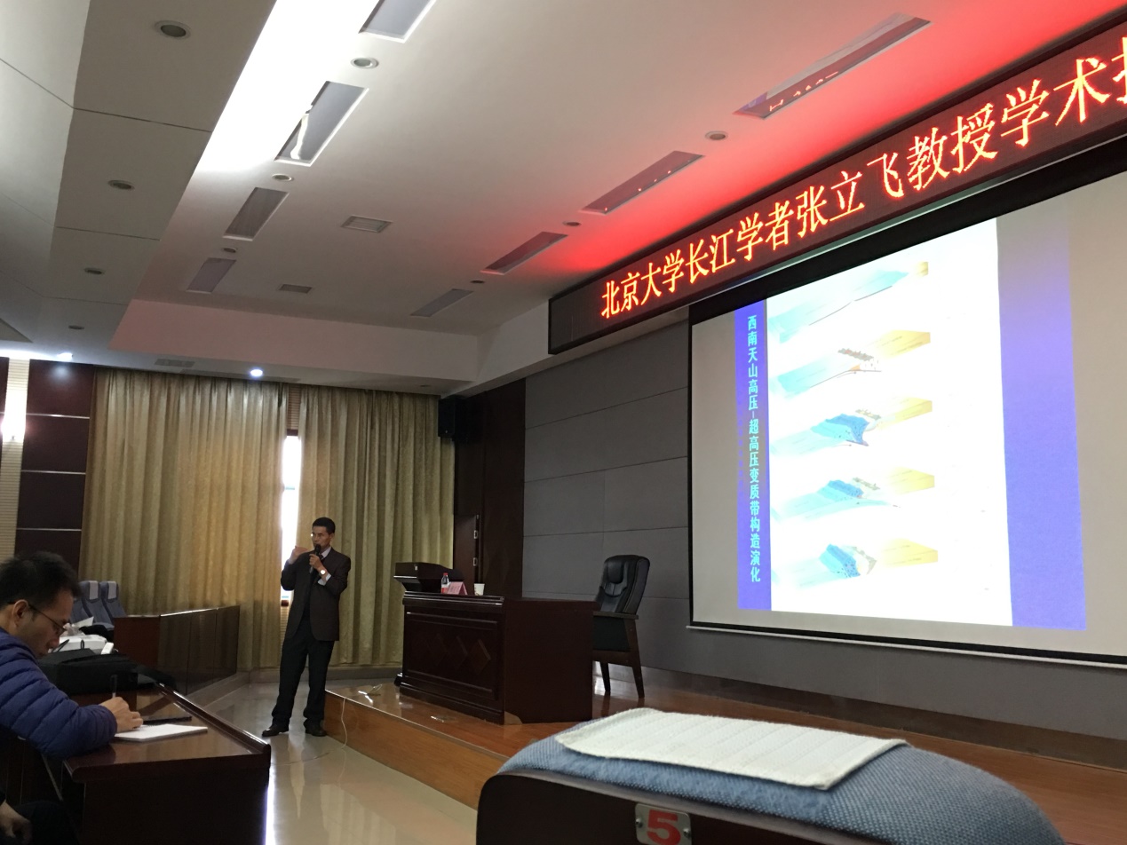 报告会上,张立飞教授首先简单介绍了什么是超高压变质作用和研究超高压作用的大陆动力学意义。其后,以出露于我国西南天山的世界上规模最大的洋壳超高压带——新疆西南天山洋壳深俯冲超高压变质带中产出的榴辉岩、蓝片岩、片麻岩等岩石为例,系统的介绍了近年来对超高压变质的岩石学、矿物学、地球化学以及同位素年代学研究成果。张立飞教授与在场师生就超高压变质岩的原岩特征、洋壳俯冲与陆壳俯冲的地质特点、超高压变质岩深俯冲与折返的动力学机制等超高压造山带演化领域的热点和前缘问题进行了交流和讨论。