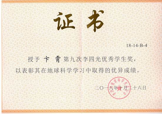 说明: 李四光优秀学生奖证书-2018.11第九次卞霄