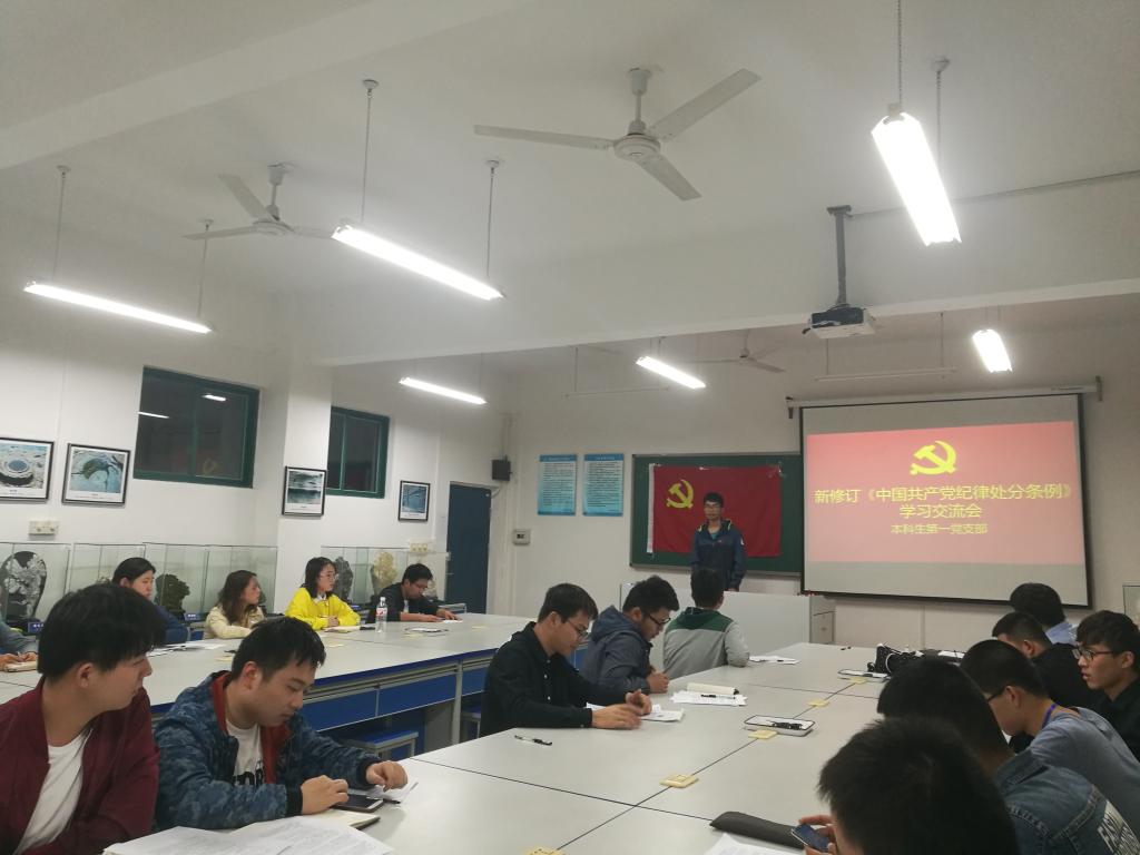 2018年10月30日,本科生第一党支部于01209开展了学习新修订《中国共产党纪律处分条例》会议。