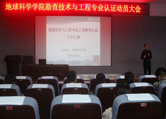 2018年10月31日,我院于逸夫楼01501报告厅召开勘查技术与工程专业认证动员大会,会议由熊彬院长主讲,全体勘查技术与工程专业学生参加。