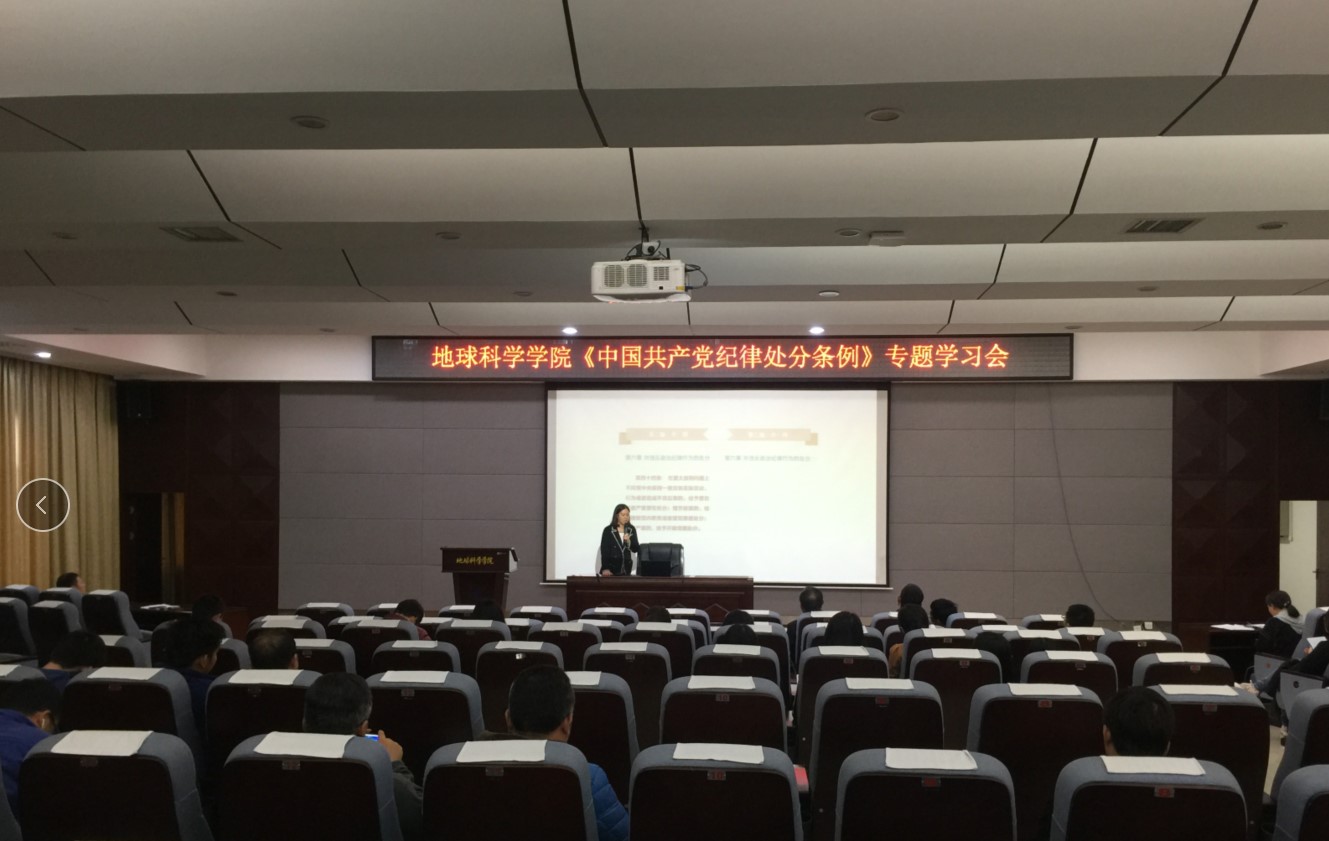 为了深入学习贯彻中共中央新修订的《中国共产党纪律处分条例》(以下简称《条例》)。根据学校党委工作部署,结合学院实际,地学院党委于2018年10月23日下午,在逸夫楼01501报告厅召开beat365手机版官网入口专题学习会,组织全体教工党员学习领会新版《条例》。地学院党委副书记、纪委书记陶剑飞老师主持了学习活动,学院全体教工党员参加了学习。