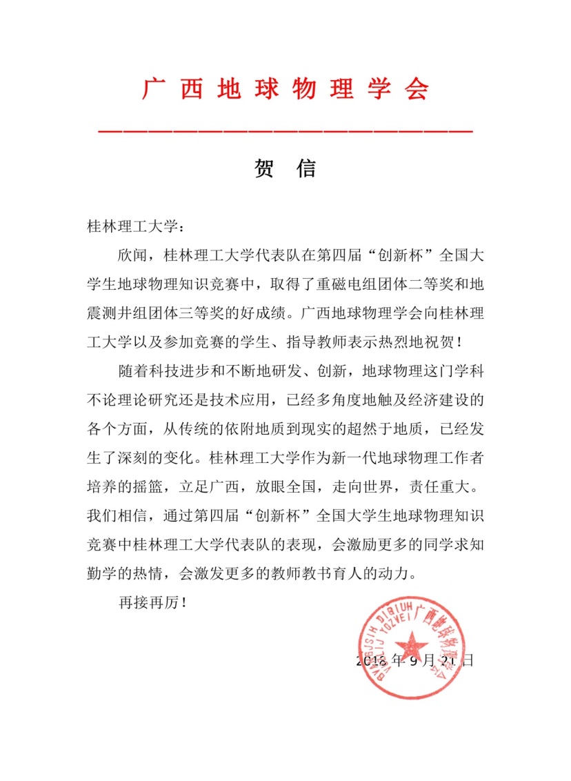 本次参赛全面展示了学校人才培养质量,彰显了学校特色与地学优势,提升了学校地球物理类专业在国内的知名度和影响力,对“双一流”建设将产生积极影响。赛后,广西地球物理学会发来了贺信,向我院的参赛选手和指导教师表示热烈的祝贺。
