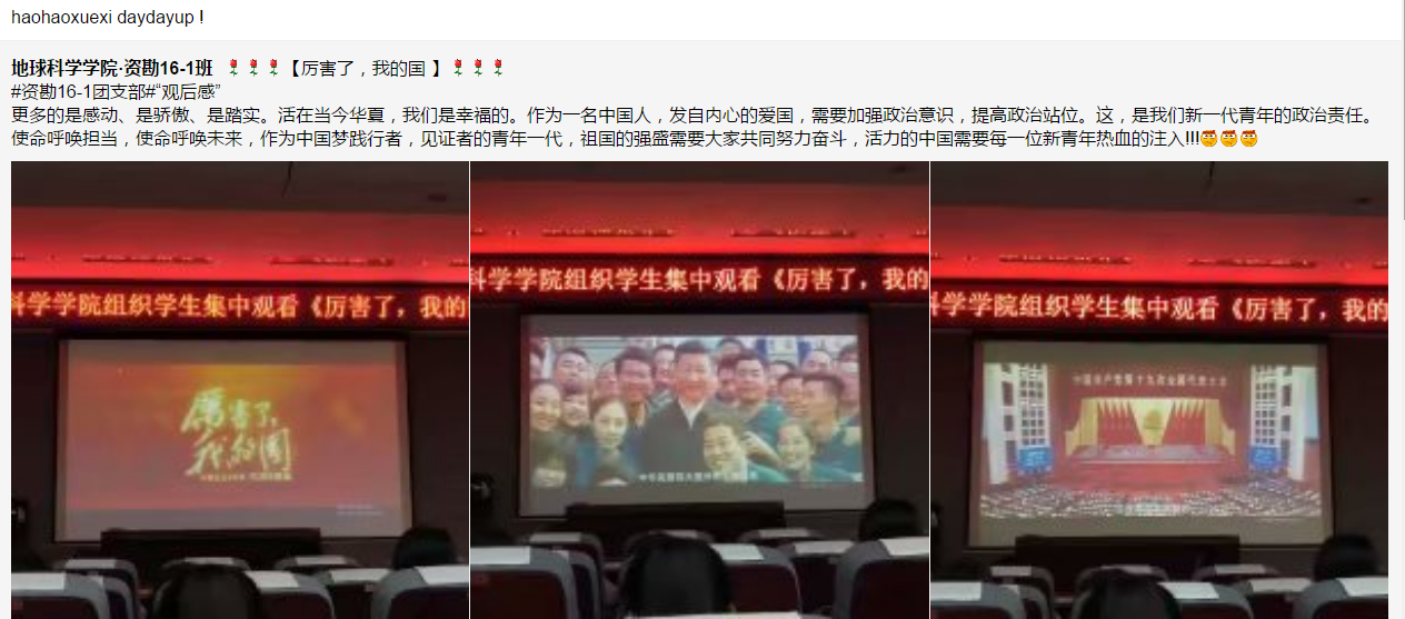 2018年5月11日,遵照学校安排,我年级组织学生集中观看影片《厉害了,我的国》。影片以习近平新时代中国特色社会主义思想为内在逻辑,展示了在创新、协调、绿色、开放和共享的新发展理念;并结合十九大精神,将祖国发展和成就以纪录片的形式第一次呈现在大银幕上,全面反映党的十八大以来中国取得了改革开放和社会主义现代化建近五年来所取得的巨大成就。影片在播放伊始,就引起了学生的关注。结束之后,更是引起同学们的热议。同学们纷纷表示,要加强政治意识,提高政治站位;作为见证者的青年一代,要以积极的热情和热血投入到活力的中国,为祖国的强大而不断奋斗!