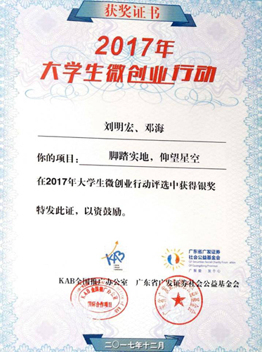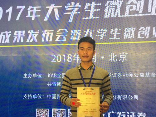 日前,由KAB全国推广办公室、广发证券社会公益基金会、共青团北京邮电大学委员会主办,广发证券股份有限公司、中国青年报社提供支持的2017年大学生微创业行动成果发布会暨大学生微创业论坛在京举办。beat365手机版官网入口勘技15-1班学生刘明宏报送的《脚踏实地,仰望星空》项目荣获银奖,获得微创业扶持资金两万元。