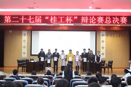 桂林理工大学第二十七届“桂工杯”辩论赛决赛于2017年12月24日15:00在雁山校区图书馆报告厅举行。本次比赛由校学生会主办,我校14级辩论队副队长磨鑫松、主力蔡青青、广西师范大学漓江学院辩论队15级队长涂艳玲、桂林理工大学博文管理学院辩论队15级副队长林琮竣作为嘉宾出席本场辩论赛并担任本场比赛的评委。