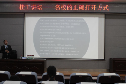 为给学生提供海外留学经验,拓宽学生的视野,增强学习动力,2017年12月5日14:25,应学校邀请,英国COSMO教育集团中国区负责人;重庆冠智教育咨询有限公司创始人,四川外国语大学国际商学院尹新哲副教授于雁山校区逸夫楼01501学术报告厅作了主题为“名校的正确打开方式”的讲座,我校两百余名学生到场聆听。