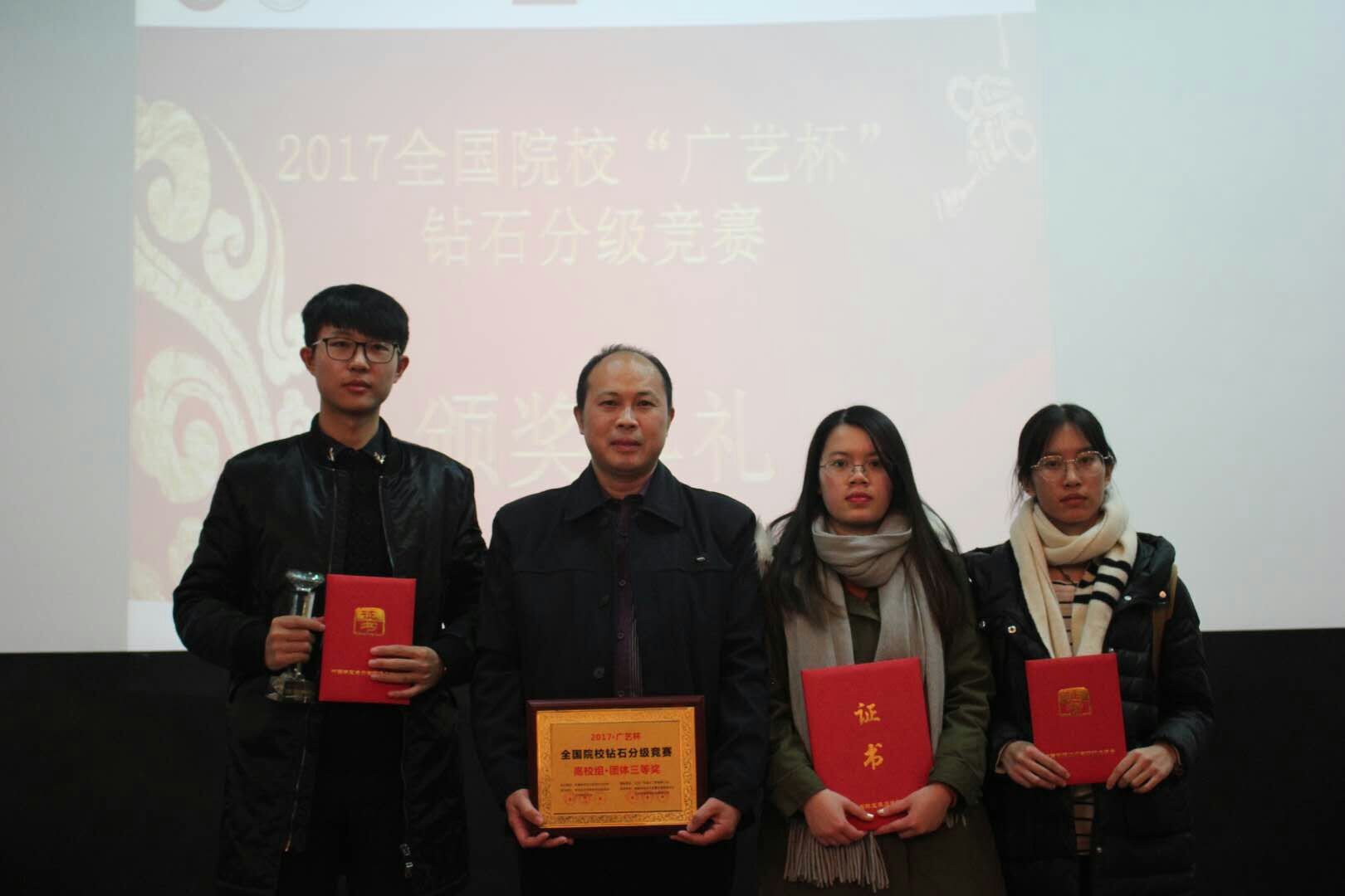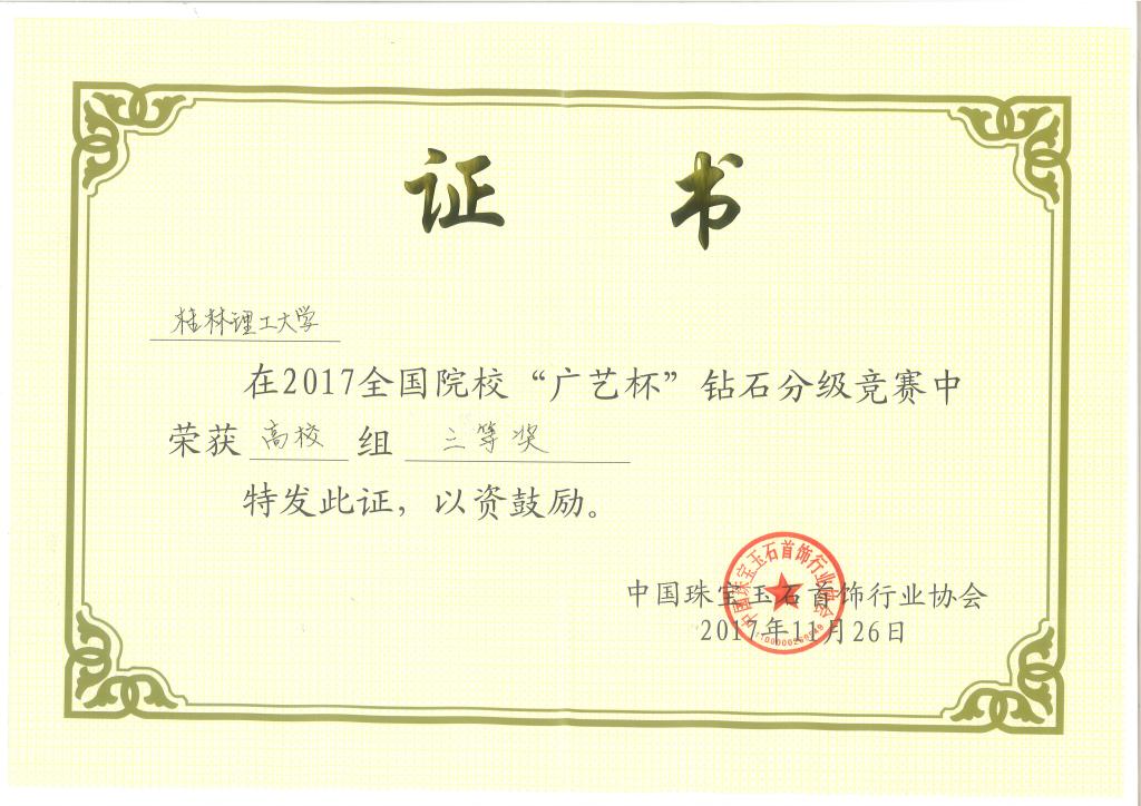 11月26日,由中国珠宝玉石首饰行业协会主办,中宝协学术教育专业委员会和河北地质大学承办的“2017全国院校‘广艺杯’钻石分级竞赛”在石家庄市完美落幕。本次大赛共有来自全国19个省(市)、自治区的31所院校参与,93名在校优秀学子代表学校参赛。每位参赛选手需在100分钟内,对10颗钻石标本进行4C分级,并以规范的方式填写4C分级报告。裁判组依据中华人民共和国国家标准(GB/T16554-2010)对选手提交的钻石分级报告进行严谨、公平的评判。在决赛中,我校代表队的琚世聪、陈绮静同学凭借稳定的心理素质和过硬的专业技能,分别获得高校组个人三等奖和优秀奖,桂林理工大学代表队荣获高校组团体三等奖。