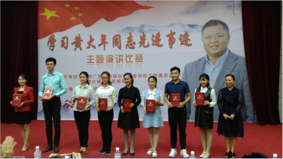 11月12日,由自治区高校工委、教育厅主办,广西师范学院承办的全区教育系统“向黄大年同志学习,做爱国敬业奉献模范”主题演讲比赛决赛在广西师范学院明秀校区举行,比赛分为教育行政部门及中小学组、高校组和区直中职学校组。我院资源勘查工程2017级实验班芦思洁同学代表我校参加高校组复赛并顺利进入决赛。决赛中,芦思洁同学与全区教育系统的30名参赛师生一起通过演讲向观众们描述了黄大年同志的感人事迹,并最终凭借高超的演讲技巧,超强的现场感染力,荣获此次演讲比赛全区二等奖,并获得评委和参赛选手的一致好评。