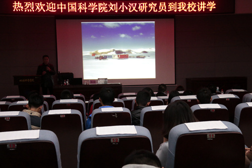 刘小汉研究员1984年至今曾七次赴南极考察,是首位进入南极格罗夫山考察的科学家,是我国南极内陆地区考察和陨石考察及搜集的开拓者及奠基人。会议开始,刘小汉研究员给大家带来了很多在当今南极考察的最新动态和热点话题,并详细地介绍了昆仑站建站、格罗夫山考察的情况以及南极科考中国所取得的“金牌”成果、全球变暖的研究现状,让师生们对我国在南极科考的情况有了深刻地了解。同时,刘小汉研究员以个人的丰富经历对“南极综合症”、南极的石油矿物开采、南极臭氧空洞等方面的问题进行了精炼地分析讲解,给了同学们身临其境般的感受。讲座幽默风趣,把高深的科学考察问题描述得浅显易懂,全场不时地响起阵阵掌声。