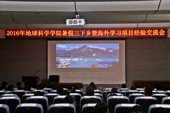 10月31日19:30,我院于逸夫楼01501举办“2016 年地学院暑期三下乡暨海外学习项目经验交流会”,出席本次活动的有我院党委副书记耿俊茂老师、团委书记蒋琼老师、学工组组长王迎波老师,来自各兄弟学院的嘉宾,以及我院各年级的同学。