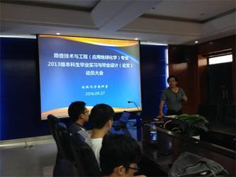 2016年9月27日星期二,地化教研室举行2013级本科生毕业实习(设计)动员大会,毕业班级为勘查技术与工程(化探)专业2013-2班的学生。该活动在雁山01215会议室举行。参与该会议的老师包括地化教研室的李双、陈远荣老师等。