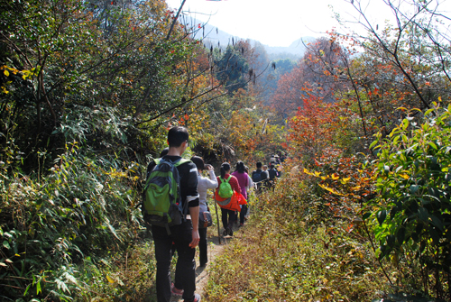 早上9点,大家在屏风校区大门口集合,统一乘坐大巴车出行。车程约一个半小时到达徒步起点,浩浩荡荡的队伍开始步行进山,穿过古老村落,漫步于山间小道,欣赏沿路红枫,虽已是冬季,但南方的山林秋色正浓,路边的的野花,野果,纯净的小溪,都成了冬日美丽的风景!徒步在山林里的山径小路,当看见一段山路落满了厚厚的红叶,真是看呆了!眼睛也霎时被温暖起来!再冷的心在这也会被这温暖的红融化!途中红彤彤的柿子挂满枝头,也给这线路增添一道靓丽的风景。