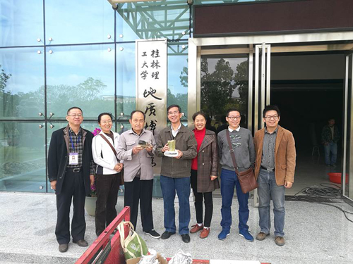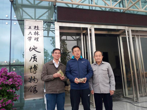 标本交接时,张学洪书记正带领学校相关领导指导地质博物馆建设工作。他亲切接见了正在办理标本验收移交手续的原化探63-1班吴虹和秦景生校友,仔细地观看标本,与校友们一一握手交谈,感谢他们对母校的一片赤诚报答之心,并与大家合影留念。