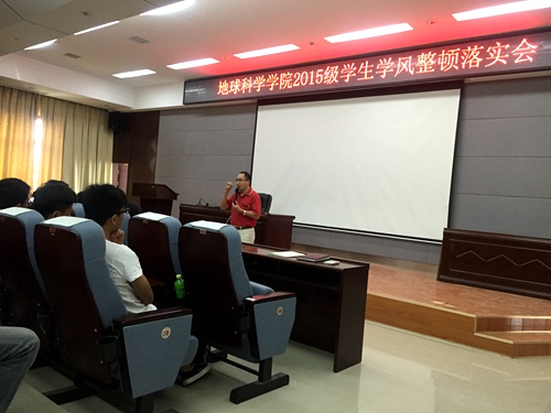 10月28日中午,为贯彻落实学校相关会议精神,根据学院学风建设工作部署要求,学院于雁山校区逸夫楼01501报告厅及时召开2015级学生学风整顿落实会。会议由15级辅导员吴田波主持,学院党委副书记耿俊茂老师出席,15级各班班委、资堪第一党支部、学生会纪检部和易班学生工作站全体成员等参加会议。