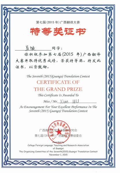 据悉,全国“外研社杯”第七届广西英语翻译大赛由广西高校大学外语教学研究会举办,旨在选拔和奖励在英语翻译及应用技能方面优秀的学生和翻译人员,有来自区内近50所本、专科院校超过2万名选手参加了本次竞赛。10月11日在桂林理工大学进行初赛,我院研究生吴限同学在初赛中脱颖而出,代表桂林理工大学参加了在桂林电子科技大学举办的广西壮族自治区翻译大赛决赛,以优异的成绩一举获得大赛特等奖,为学校及学院争得了荣誉。