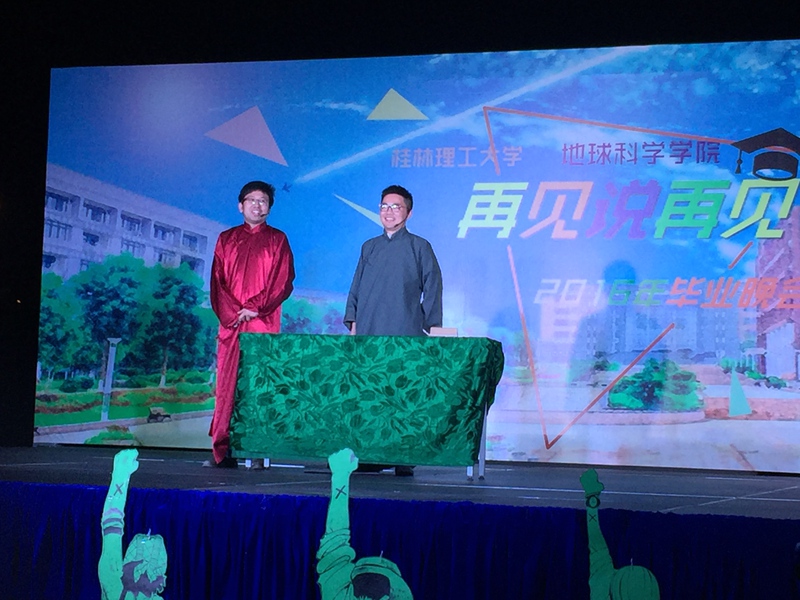 毕业晚会在星空乐队的原创旋律中开场,现场气氛缓缓点燃。晚会致辞中,姜书记在表达对384名毕业生祝福的同时,现场更以歌寄情,赢得掌声雷动。舞台上,既有研究生带来的现代版《唐伯虎点秋香》、学弟们反串的舞蹈《四只小天鹅》等欢乐节目,也有我院赵义来老师携其爱人为大家倾情献唱《平凡之路》和《像风一样自由》、学工办王迎波和吴田波老师本色出演相声作品《我忍不了(校园文明版)》等多种元素。此外,晚会现场也邀请到了外国语学院、校艺术团和校话剧社的同学们登台表演。