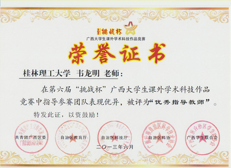 近日,由共青团广西区委、自治区教育厅、自治区科技厅、自治区科协、自治区学联联合举办的第六届“挑战杯”广西大学生课外学术科技作品决赛暨成果转让推介会圆满落幕。我院的2件作品获奖,其中特等奖1件,一等奖1件,韦龙明老师获得“优秀指导老师”荣誉称号,韦龙明教授还作为高校唯一代表在大赛举办的“青年创新人才培养与创新广西建设论坛” 上作了主题发言,介绍了教师参与指导学生科技活动的经验,结合自身体会,就如何激发学生科技创新意识,提高创新能力,同与会的代表们进行了经验分享。