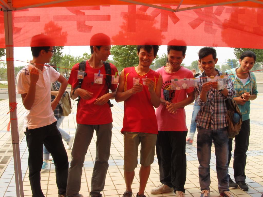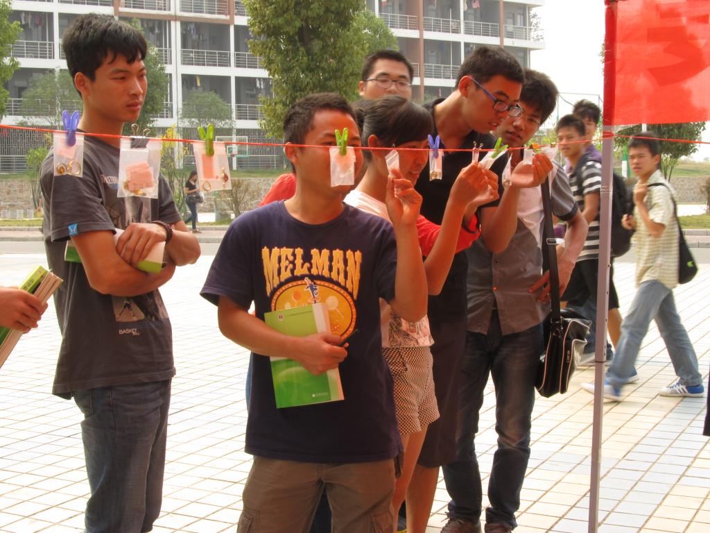 中午时分,展会达到高潮,小小的展棚被前来观展的同学们围满。大家怀着好奇心情,不断打量着陈列的各种展品,同时忍不住赞叹作者的心灵手巧,并不断询问“这些都是他们自己做的么?他们是怎么完成的?”有些13级新生在发出赞叹的同时也说自己以后要做出同样的作品。