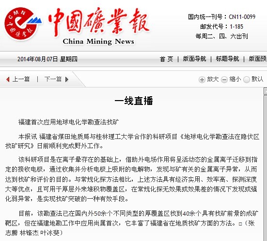 8月7日,《中国矿业报》对我院与福建省煤田地质局合作开展的“地球电化学勘查法在隐伏区找矿研究”科研项目给予报道,称“地球电化学勘查法在福建地勘工作中应用尚属首次,丰富了福建省在地质找矿方面的方法。”