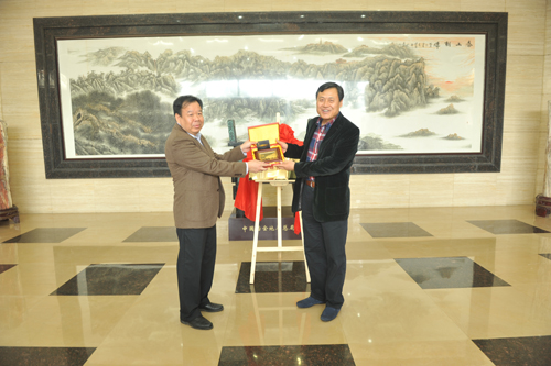 梁福沛副校长(左)向中国冶金地质总局山东局郑明坤副局长(右)赠送学校纪念品