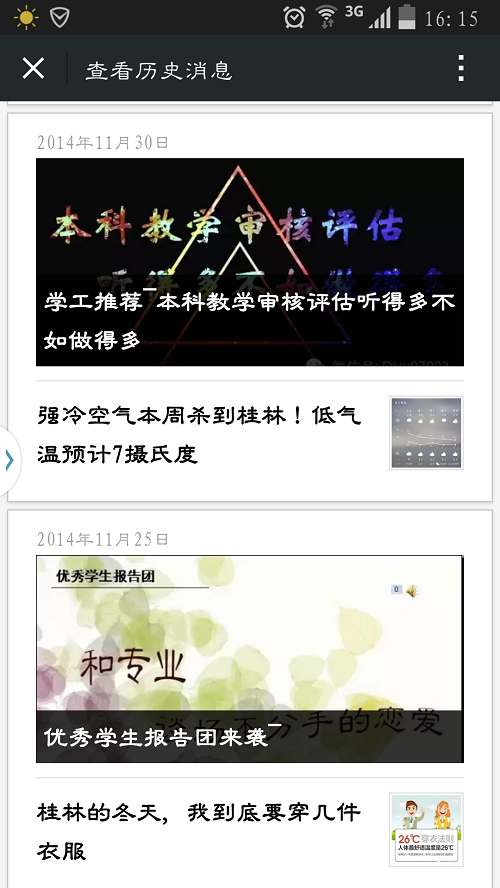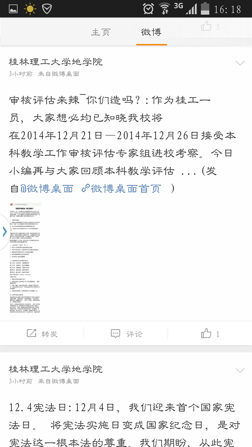 二、院团委通过微信公众平台“地学大小事”和beat365手机版官网入口新浪官方微博“桂林理工大学地学院”这两个主流的新媒体,向学生推送和宣传关于本科教学评估工作的相关内容。