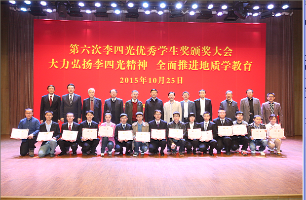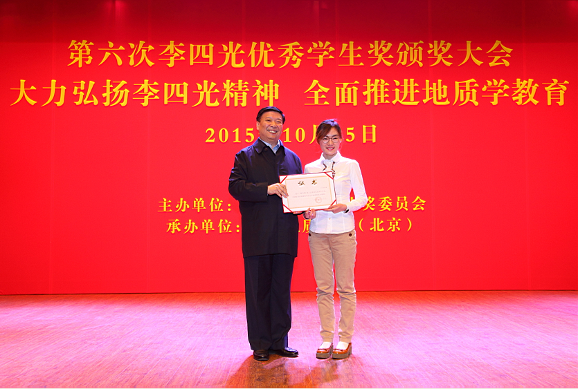 10月25日,第六次“李四光优秀学生奖”颁奖大会在中国地质大学(北京)举行,国土资源部部长、党组书记,李四光地质科学奖委员会主任委员姜大明出席颁奖仪式并为获奖学生颁奖。共有来自中国地质大学(北京)、中科院南京地质古生物研究所等10所高校或科研院所的18名学生获此殊荣。我院韦龙明教授指导的应届毕业硕士研究生周旻玥荣获李四光优秀学生提名奖,这是继2014届资源勘查工程专业本科生王潇潇之后,我院学子再次荣获此项殊荣。