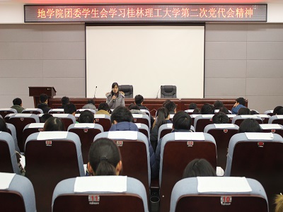 专题学习会上,蒋琼老师带领同学们学习了党代会报告。首先,回顾了学校过去五年的工作成绩和基本经验,然后传达了桂林理工大学第二次代表大会精神,贯彻落实好党代会提出的未来五年的奋斗目标,主要任务等。最后,耿书记讲话,他强调了学校的“两个重点”、“三个特色”和“五个提升”等内容。并且督促大家务必认真学习党代会报告内容,了解学校未来发展制定的目标和举措。