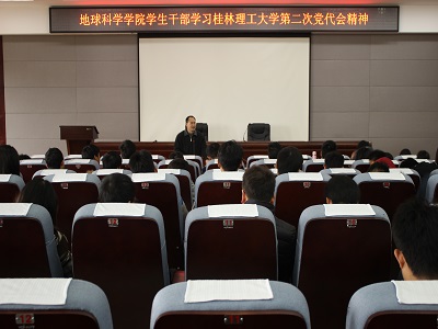 2015年1月12日中午12:30,地学院学生干部学习第二次党代会精神专题会议在逸夫楼01501会议室召开。我院党委副书记耿俊茂、团委书记蒋琼及学生学院学生干部参加了会议,会议由蒋琼老师主持。