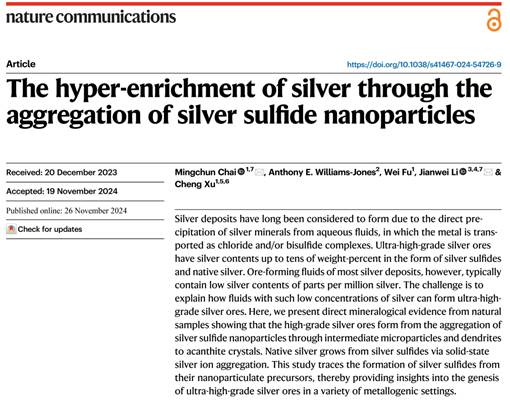 【文章信息】Mingchun Chai, Anthony E. Williams-Jones, Wei Fu, Jianwei Li, and Cheng Xu. 2024. The hyper-enrichment of silver through the aggregation of silver sulfide nanoparticles. Nature Communications, 15:10245, https://doi.org/10.1038/s41467-024-54726-9.