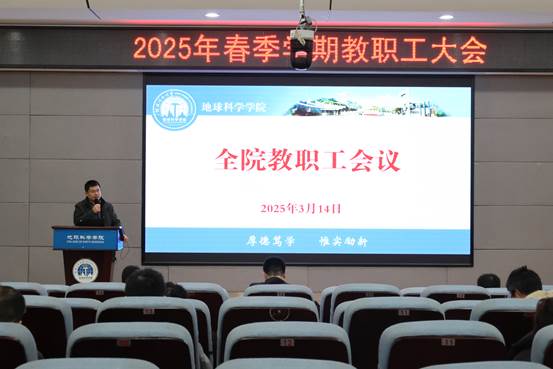 会上,学院党委书记陈小波传达了学校党委三届九次全会和学校高质量发展大会精神,分析了当前学院发展面临的形势与挑战。他指出,全会和大会的召开明确了学校高质量发展的目标和路径,2025年是学院高质量发展的关键一年,发展任务重,时间紧,全院教职工要深刻领会会议精神,切实把思想和行动统一到学院决策部署上来,居安思危,团结一心,以更高的政治站位、更强的责任担当,推动学院高质量发展再上新台阶,奋力谱写建设“在地学领域具有影响力的新时代beat365手机版官网入口”崭新篇章!