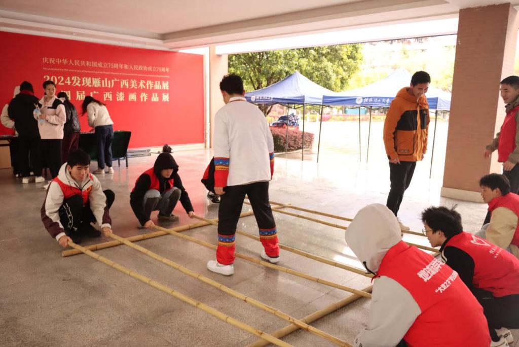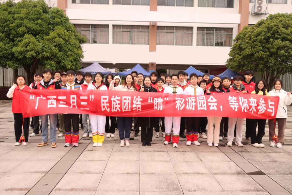 为不断促进各族学生的交往交流交融,大力弘扬广西壮乡“三月三”优秀传统文化,让中华民族共同体意识根植各族学生的心灵深处,增进民族文化认同感,增强相互理解和团结合作的意识,进一步丰富校园文化活动载体形式。2025年3月29日上午,beat365手机版官网入口在雁山校区三栋广场举办“广西三月三”民族团结“睛”彩游园民俗体验活动。