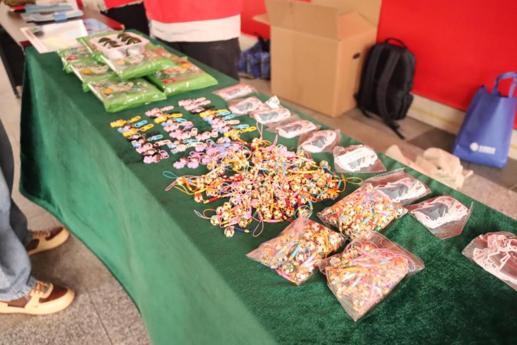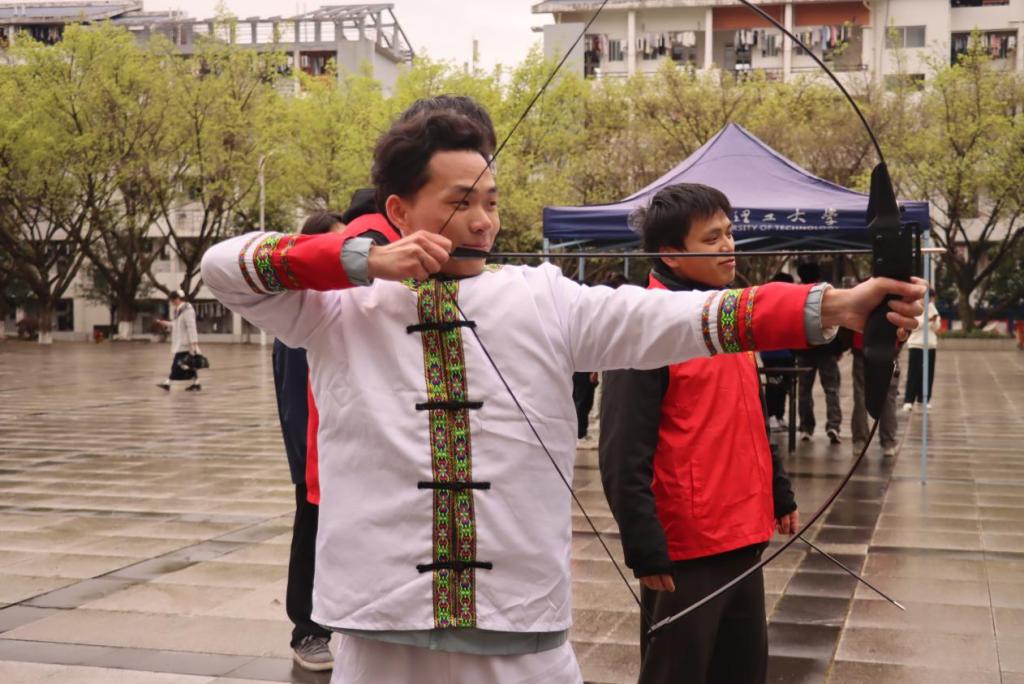 本次游园民俗体验活动设置了竹竿舞、抛绣球、射箭挑战、滚铁圈、走板鞋、民族元素拼图等六个项目,通过“文化体验+趣味竞技”的形式展开,吸引了200余名学生的热情参与。大家踩着音乐鼓点、伴随着竹竿开合节奏跳跃,展现了出色的协调能力;两人搭档,相互配合,将绣球精准抛入背篓;开弓、瞄准、脱弦,一气呵成,让箭矢直奔靶心;三人成队,共同驾驭板鞋,喊着“一二一”,在赛道上穿梭;一人或两人,认真观察摸索,每一盒积木都仿佛承载着一个民族的故事,各个民族最具代表性的元素被巧妙地浓缩进这些方寸大小的积木组件之中,“这看起来像苗族的图腾,你看它和旁边这个银饰图案的积木组合起来,就是苗族盛装出行的画面。” 同学们就这样你一言我一语,知识在互动中碰撞出火花。