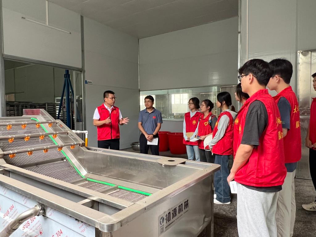 座谈会后,实践团成员在驻村书记的引领下,走进一个个充满烟火气的产业车间。顺溪村的“灌之坊”速食油茶生产车间里,工人们正抢工期、赶进度,为即将投产生产做最后冲刺;永富村的雪梨干生产车间内,金黄饱满的雪梨经削皮、切片、烘干、包装的流水线魔法,从枝头鲜物蜕变为礼盒中透着清香的馈赠佳品,驻村书记指尖划过包装好的产品,细数着从田间到舌尖的每道工序;三树村“湖中禾”生态稻米生产车间的货架上,不同品种的稻米包装整齐排列,驻村书记拿起一袋有机香米,娓娓道来品牌从无到有、从弱到强的培育历程,随后又带领大家走进稻田深处,脚下的泥土沾着晨露,眼前的稻穗压弯枝头,田野调查在稻浪翻滚中变得鲜活可触;东阳村的黄关面条生产车间里,雪白的面团经揉、擀、切、晒等传统工序流转,在现代化设备的辅助下焕发新活力,驻村书记详解着非遗技艺与现代生产的融合之道。