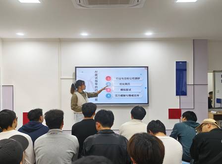 在活动上半场,周密老师聚焦AI技术赋能,系统讲解了如何运用智能工具提升求职竞争力。她现场演示了AI在行业调研、简历优化和模拟面试等环节的实际应用,帮助学生理解如何借助技术手段更精准地匹配岗位需求,提升求职成功率。