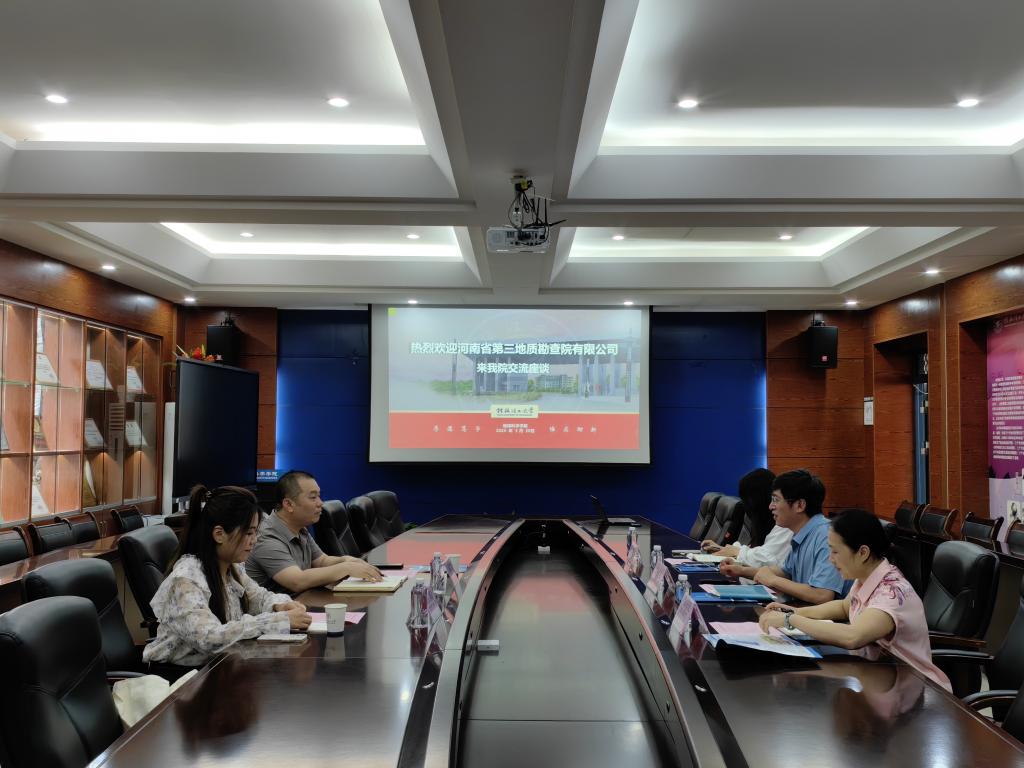 近日,河南省第三地质勘查院有限公司到学院座谈交流。河南省第三地质勘查院有限公司总经理助理郭海龙、团委书记雪枫、学院副院长付伟、党委副书记唐丽华出席会议。